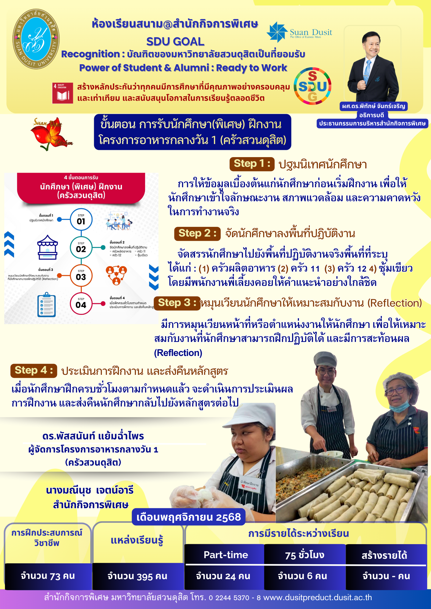 - ขั้นตอนการรับนักศึกษา (พิเศษ) ฝึกงาน โครงการอาหารกลางวัน 1 (ครัวสวนดุสิต) เดือนพฤศจิกายน 2568