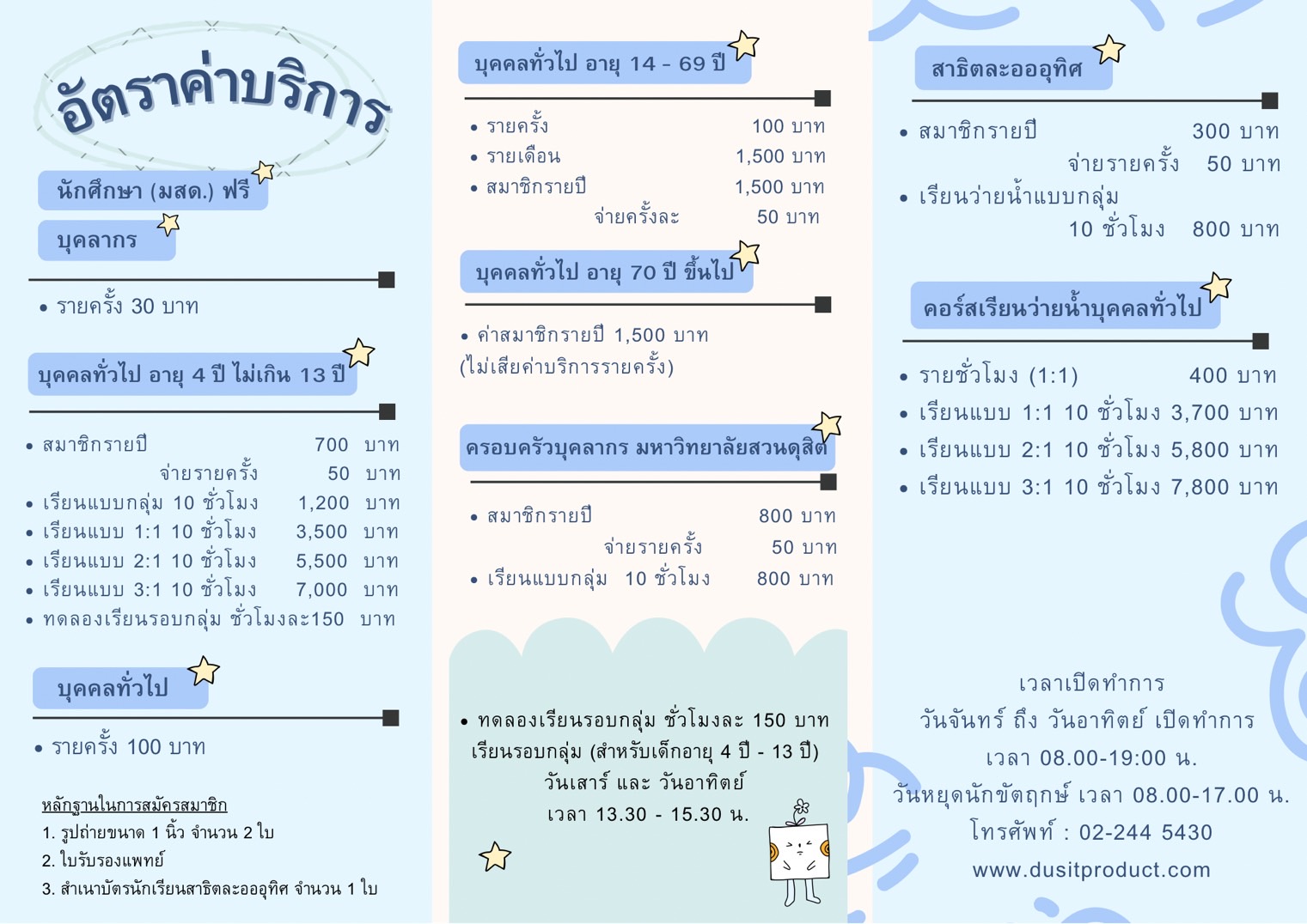 แผนกสระว่ายน้ำ เปิดให้บริการทุกวันจันทร์ – วันอาทิตย์ และ วันหยุดนักขัตฤกษ์ เวลา 08.00 – 19.00 น.ติดต่อ/สอบถาม 02-244-5430หรือ