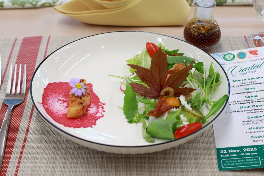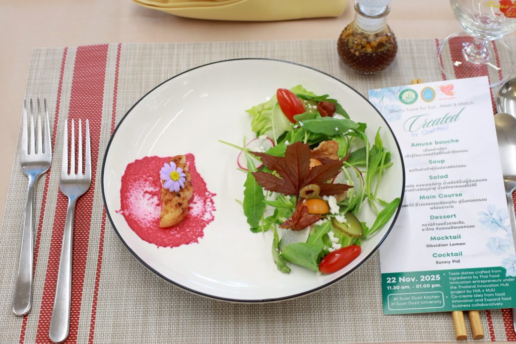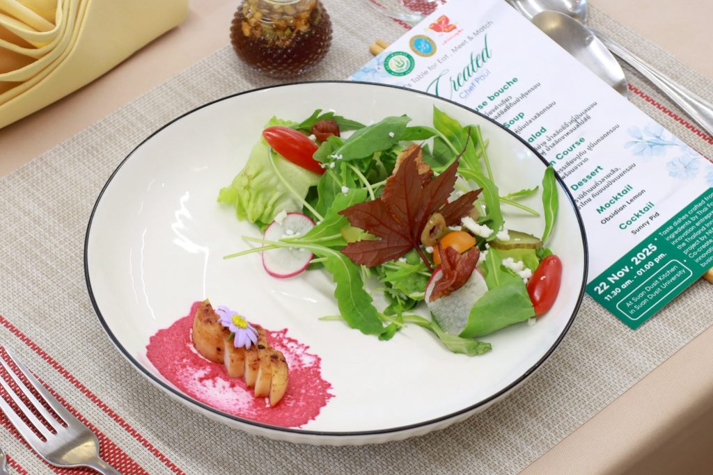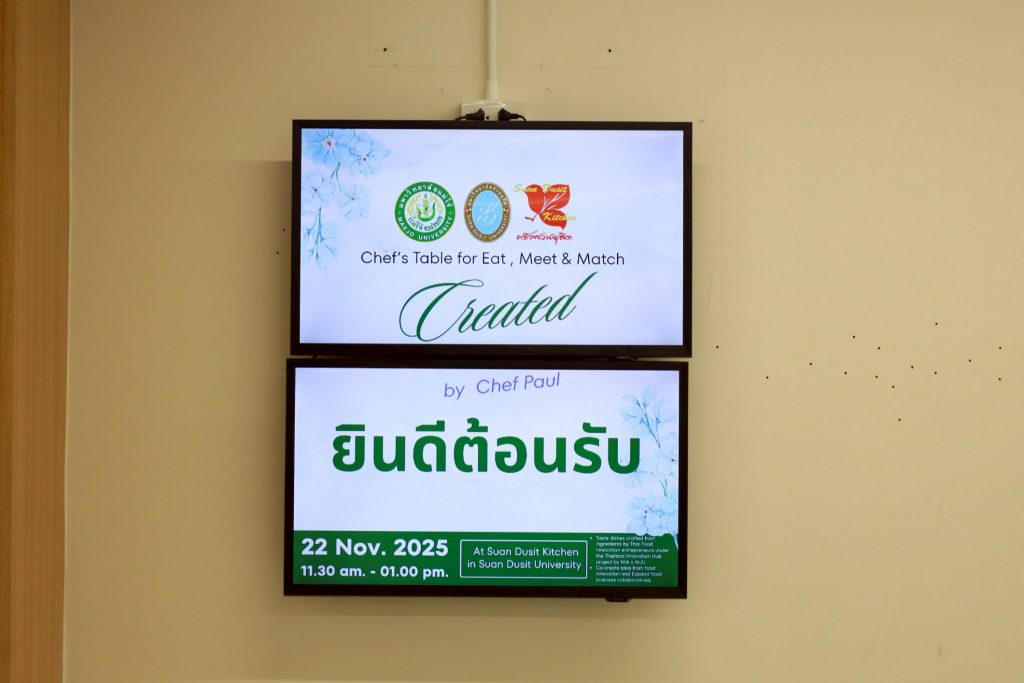 โครงการอาหารกลางวัน 1 (ครัวสวนดุสิต) สำนักกิจการพิเศษ มหาวิทยาลัยสวนดุสิต จัด “Chef’s Table for Eat Meet & Match : Business Matching” สนับสนุนผู้ประกอบการนวัตกรรมอาหารสู่ตลาดสากล โดยสำนักงานนวัตกรรมแห่งชาติ (NIA) ร่วมกับ มหาวิทยาลัยแม่โจ้ ภายในงานประกอบด้วยการนำเสนอเมนูอาหารเชิงสร้างสรรค์จากวัตถุดิบของผู้ประกอบการนวัตกรรมอาหาร อาทิ พาสต้าจากข้าวไทย นมถั่วลายเสือ เส้นอกไก่ Plant-Based น้ำมะนาว เต้าหู้โซมะบอลล์ ผ่านการรังสรรค์เมนูโดย เชฟพอล อาจารย์พงษ์อนันต์ ศิริแสงไพรวัลย์ ร่วมกับ โครงการอาหารกลางวัน 1 (ครัวสวนดุสิต) ถ่ายทอดอัตลักษณ์วัตถุดิบท้องถิ่นผ่าน storytelling ผสานความดั้งเดิมกับความร่วมสมัย สู่เมนูสไตล์ Authentic & Thai Twist ณ ครัวสวนดุสิต มหาวิทยาลัยสวนดุสิต เมื่อวันที่ 22 พฤศจิกายน 2568