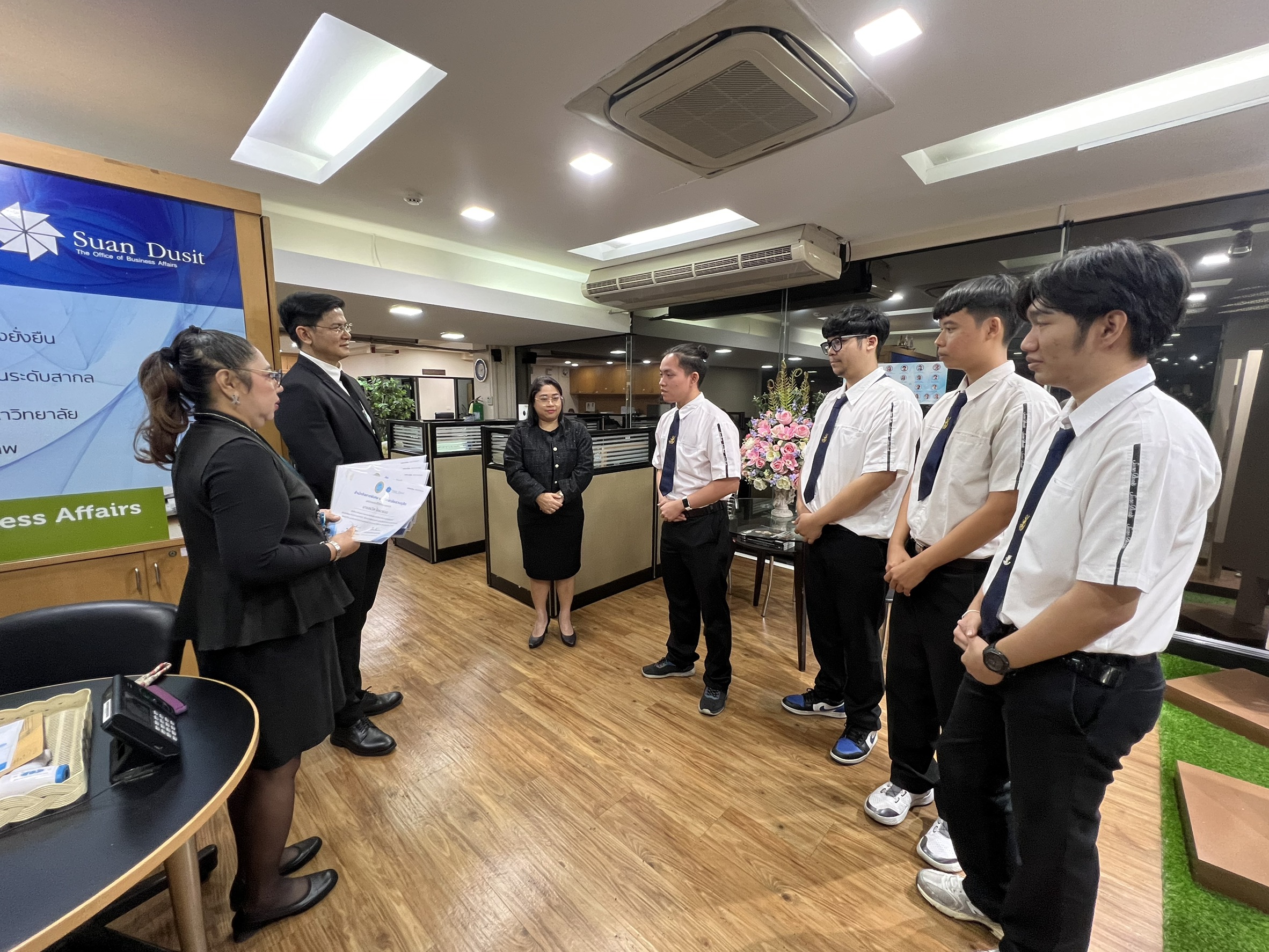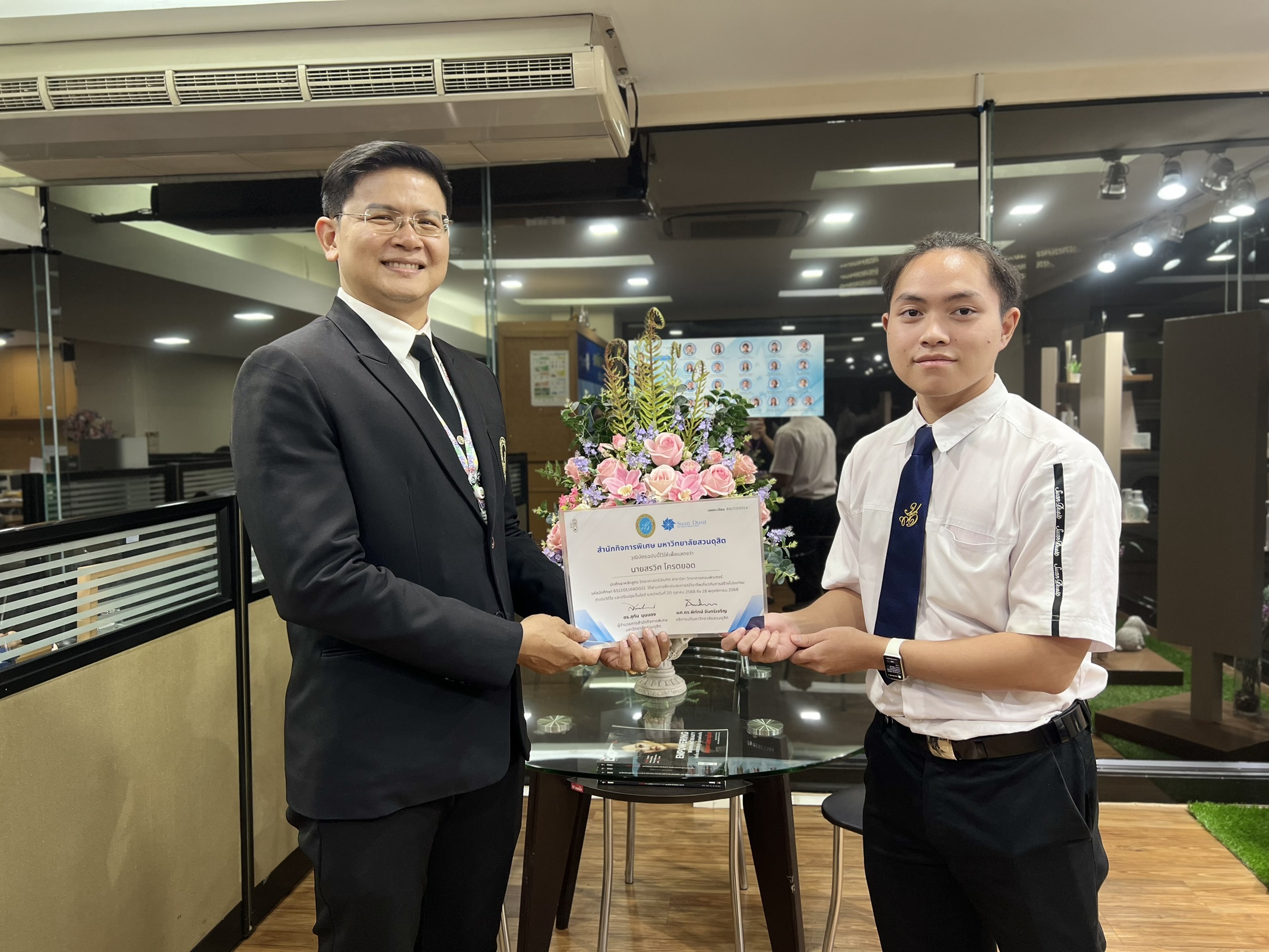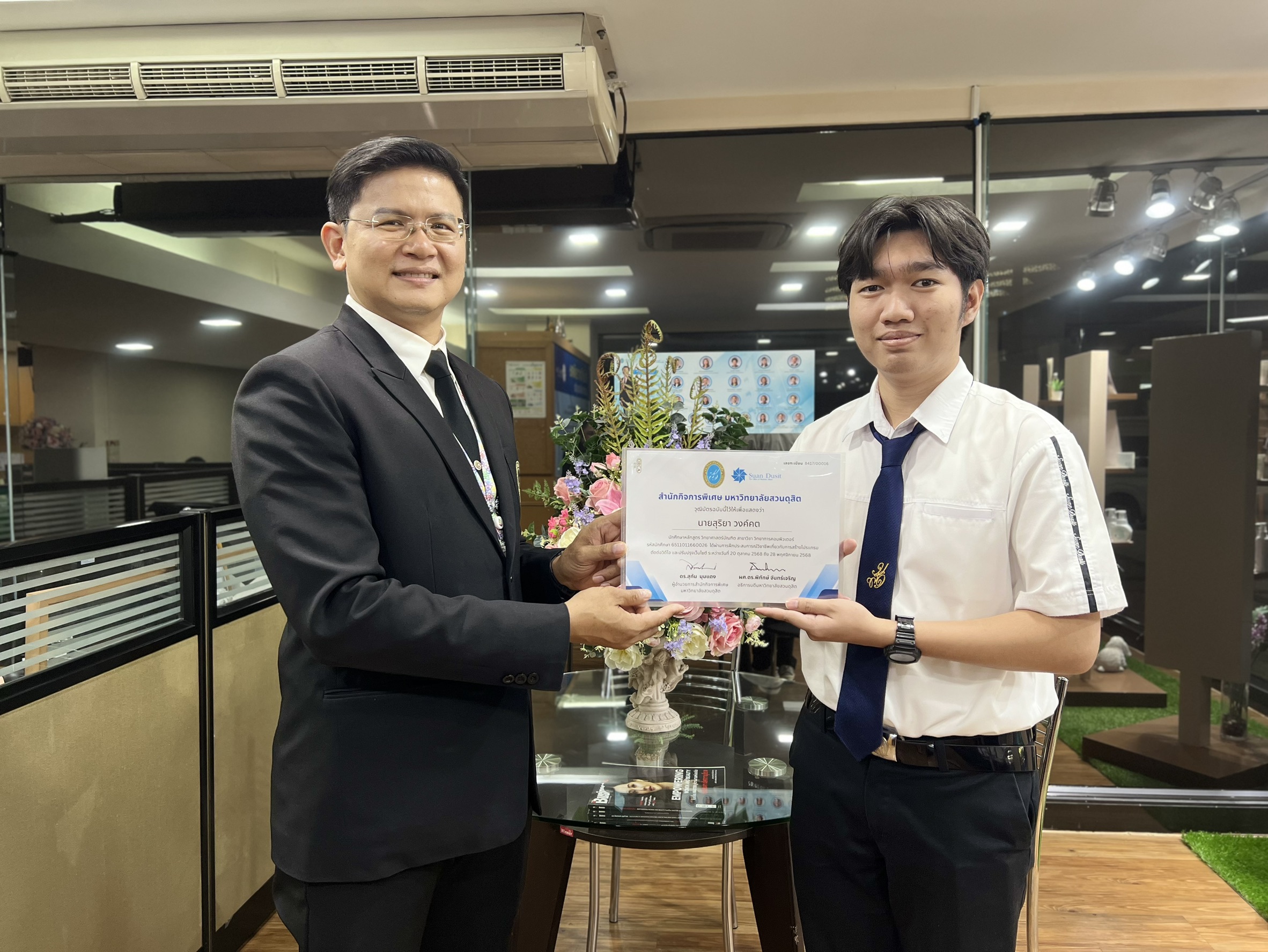 ดร.สุทัน มุมแดง ผู้อำนวยการสำนักกิจการพิเศษ มหาวิทยาลัยสวนดุสิต กล่าวแสดงความยินดี และมอบวุฒิบัตรรับรองการฝึกประสบการณ์วิชาชีพแก่นักศึกษาหลักสูตรวิทยาศาสตรบัณฑิต สาขาวิชาวิทยาการคอมพิวเตอร์ คณะวิทยาศาสตร์และเทคโนโลยี จำนวน 4 คน ที่ผ่านการฝึกประสบการณ์วิชาชีพ ระหว่างวันที่ 20 ตุลาคม – 28 พฤศจิกายน 2568 ในด้านการสร้างโปรแกรม ตัดต่อวิดีโอ และการพัฒนาปรับปรุงเว็บไซต์ ณ สำนักงานอำนวยการ สำนักกิจการพิเศษ มหาวิทยาลัยสวนดุสิต เมื่อวันที่ 28 พฤศจิกายน 2568